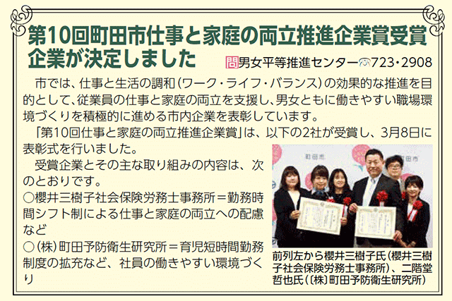 平成30年3月町田市仕事と家庭の両立推進企業賞を受賞いたしました。